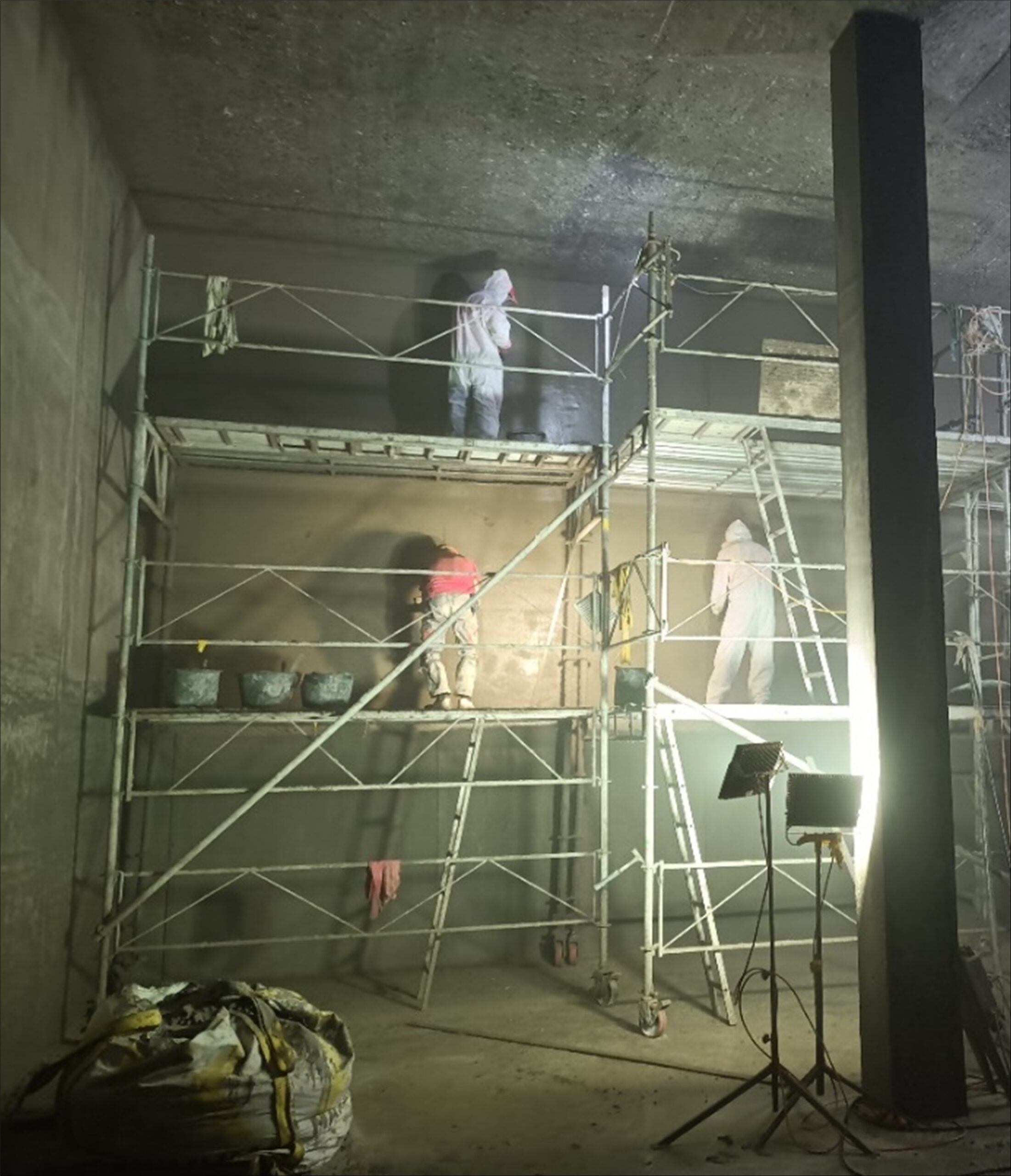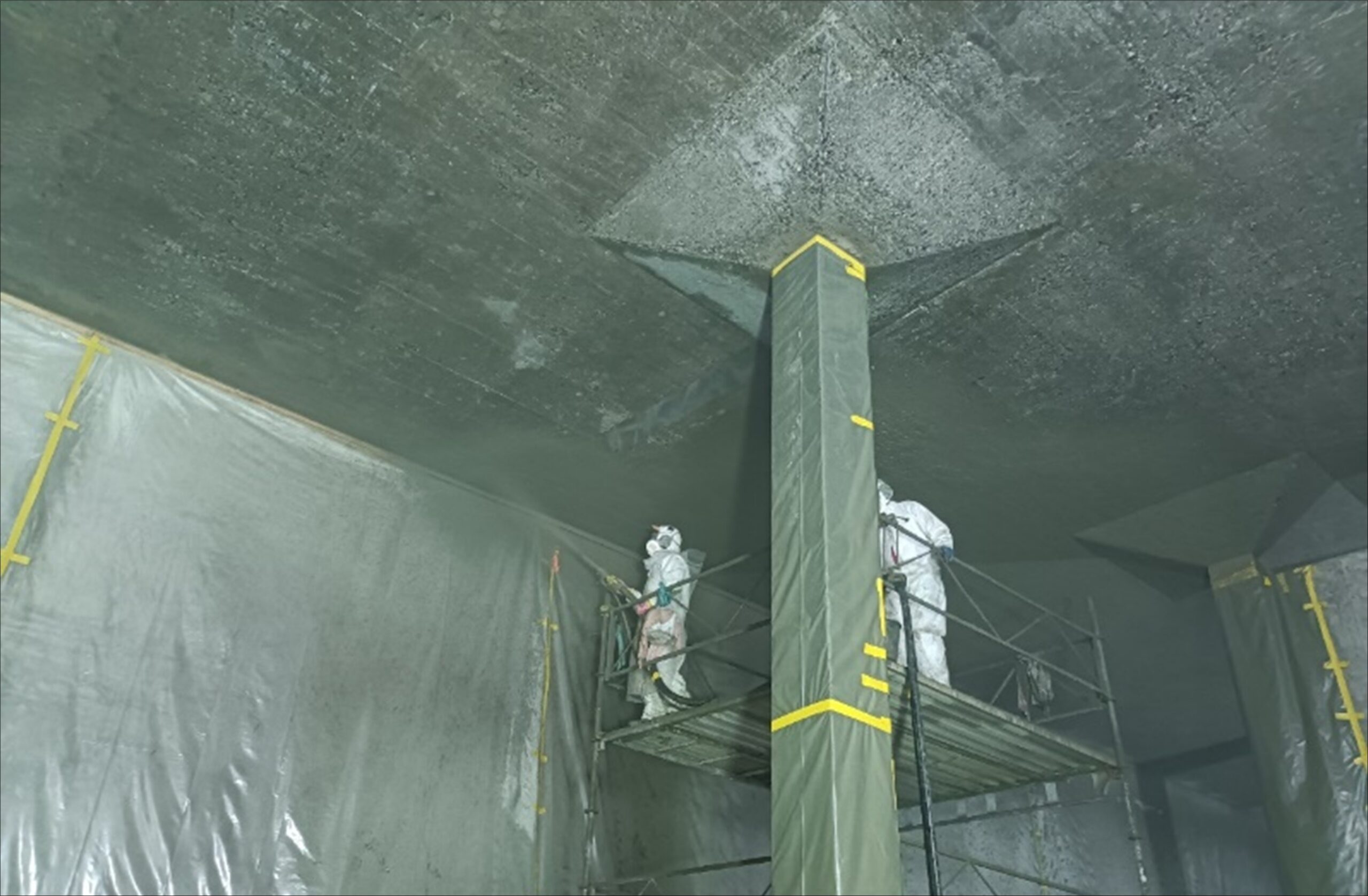 - Préparation des supports par hydrodémolition et nettoyage à l’eau haute-pression des murs périphériques et de la sous-face de la dalle en toiture – 2’700 m2